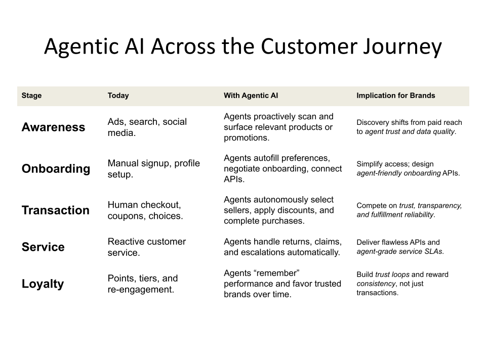 My central hypothesis — that Agentic AI will lead to much more personalized and connected consumer experiences — is, I believe, correct. But it also means that loyalty becomes more “earned” and continuously evaluated, rather than static. The brand that once won a consumer’s loyalty may lose it if it fails to satisfy the agent’s heuristics.
